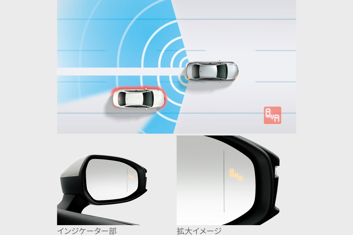 走行中、ドアミラーでは確認しにくい後側方エリアに存在する車両に加えて、隣接する車線の最大約70m後方までモニターし、急接近してくる車両も検知します。車両を検知するとドアミラー内のインジケーターが点灯、車両を検知した状態でウインカーを操作するとインジケーターが点滅するとともにブザーが鳴り、より注意を喚起します。