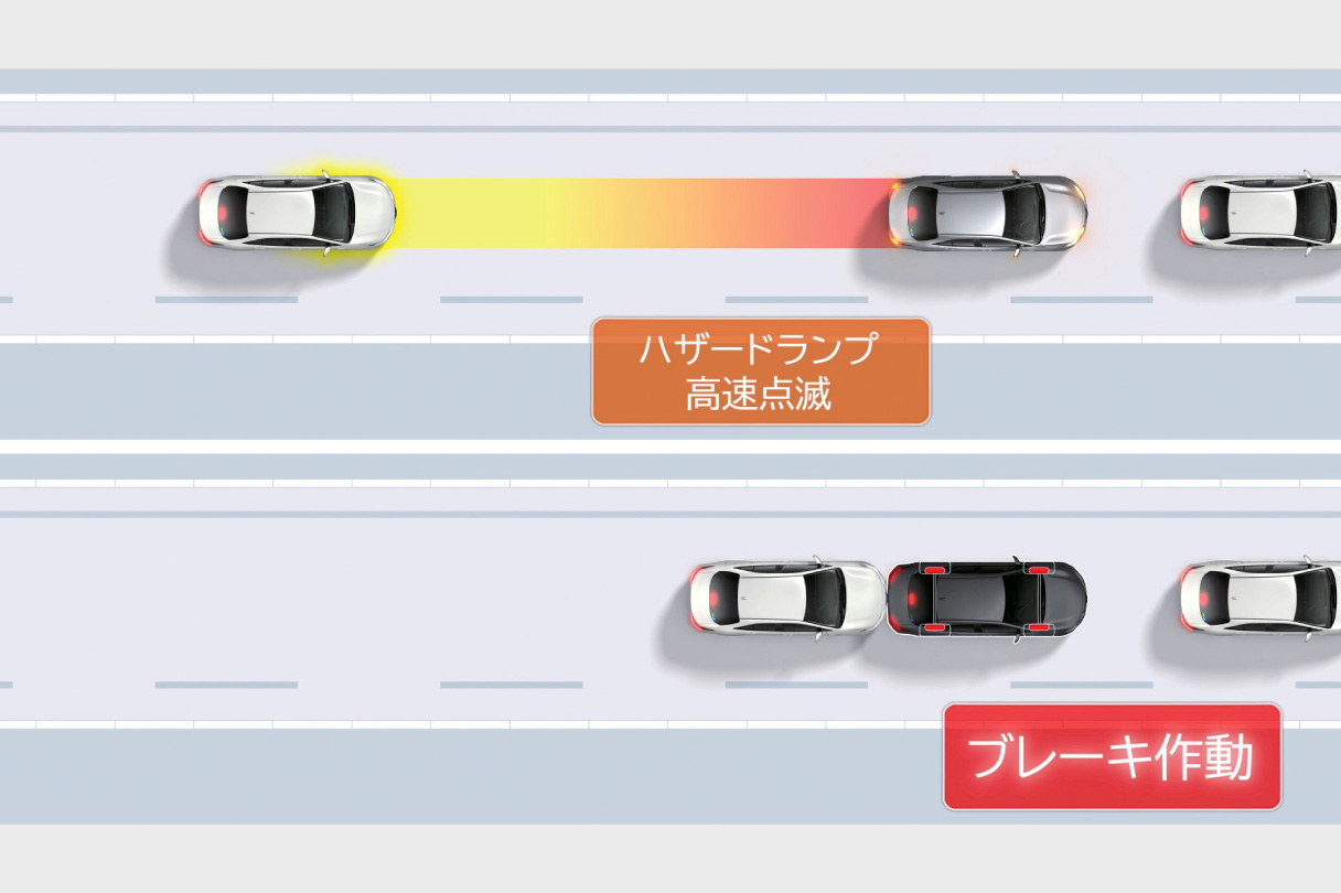後方車両から追突される可能性が高い場合、ハザードランプを高速点滅させて後方車両に注意喚起します。それにより、追突事故の被害軽減に貢献します。