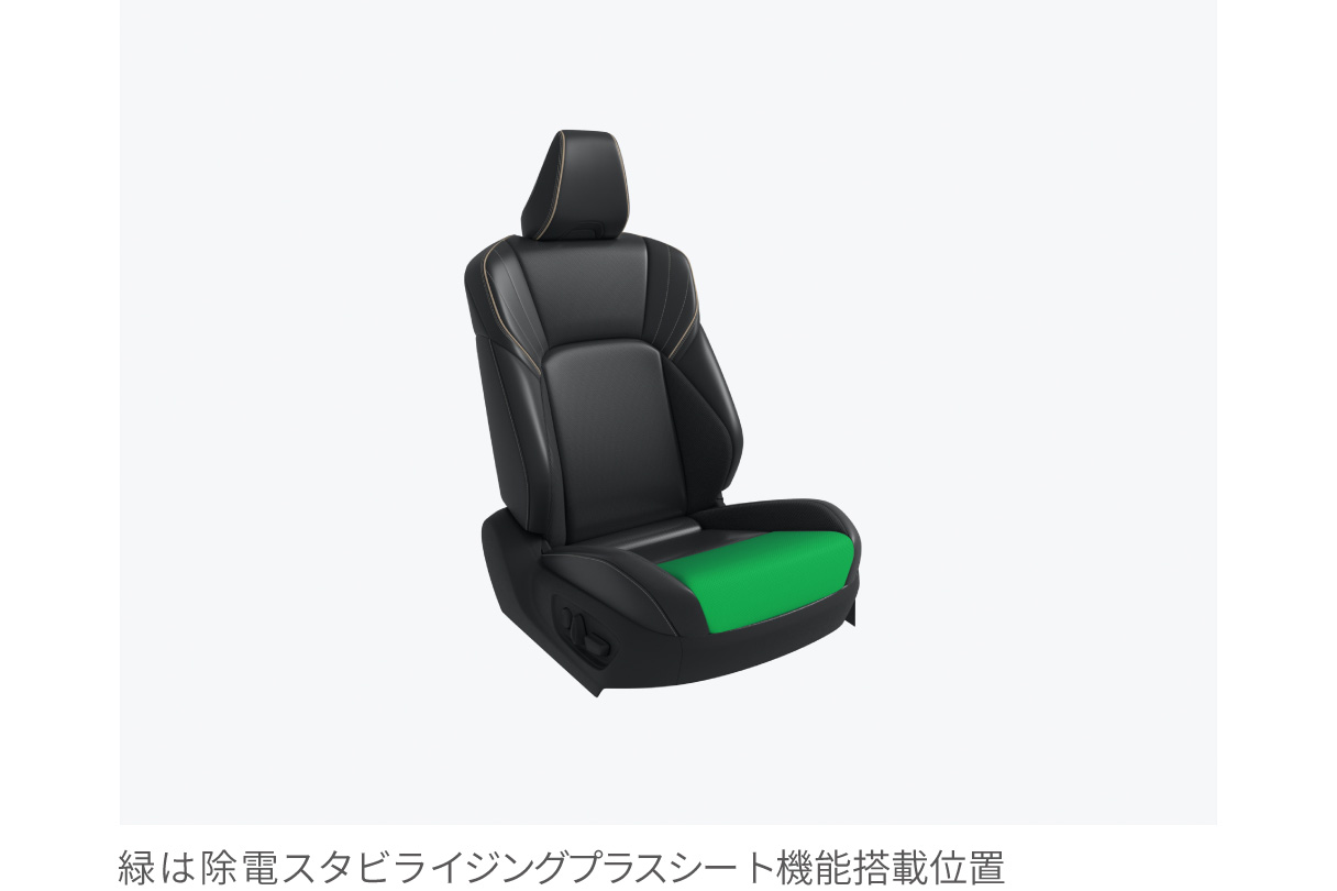 運転席の一部に除電機能付表皮を設定し、タイヤ周りの帯電を低減することで、安定した車両挙動に貢献し、より疲れにくく気持ちのいいドライビングに寄与します。