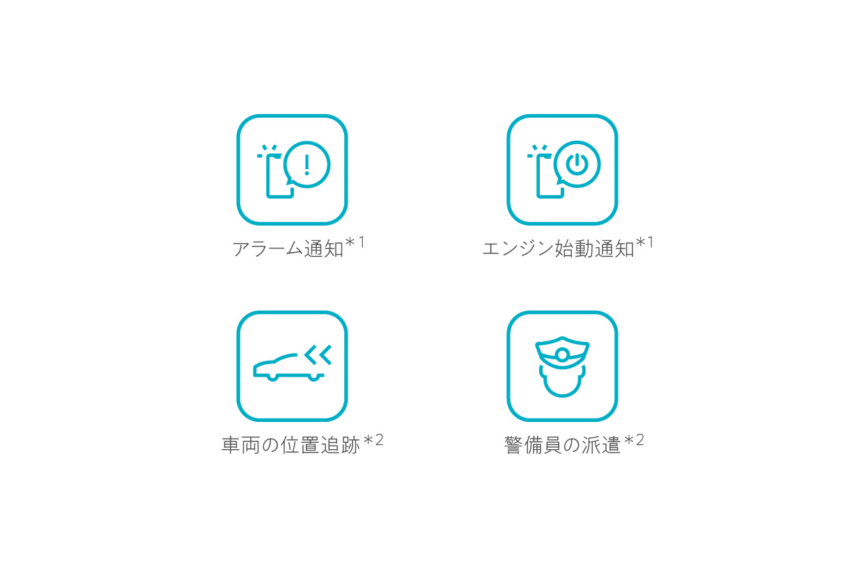 ドアのこじ開けなどでオートアラームの作動を検知すると、メール・電話やスマホアプリ「MyTOYOTA」*5にすみやかにお知らせします。さらにお客様のご要望により、車両の位置追跡や警備員の派遣も行います。