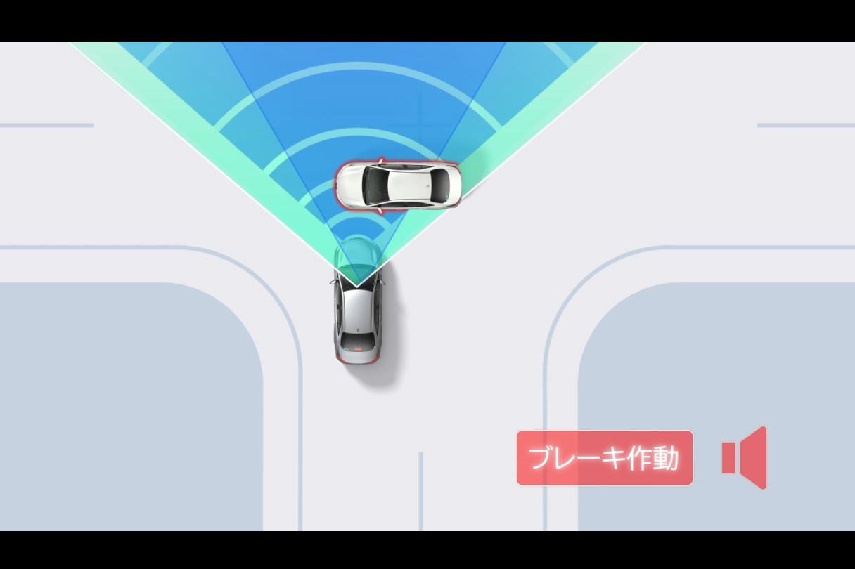交差点に進入する際、交差する車両や自動二輪車をミリ波レーダーと単眼カメラで検出。ブザーと表示で衝突の可能性を知らせると同時に、プリクラッシュブレーキを作動。衝突回避または被害軽減をサポートします。